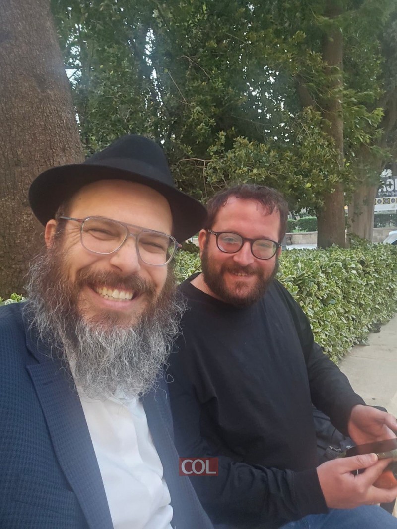 השליח בקטמון המושבה בירושלים הרב אור זיו לצד מקורבו יונתן אוריך, יועצו של ראש הממשלה, בעת קבלת הידיעה כי אוריך יכול אחרי כמעט שנה לשוחח עם נתניהו