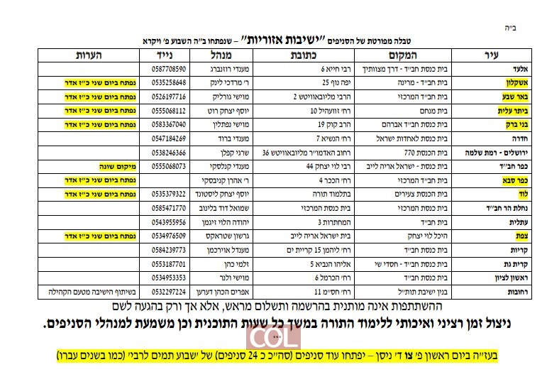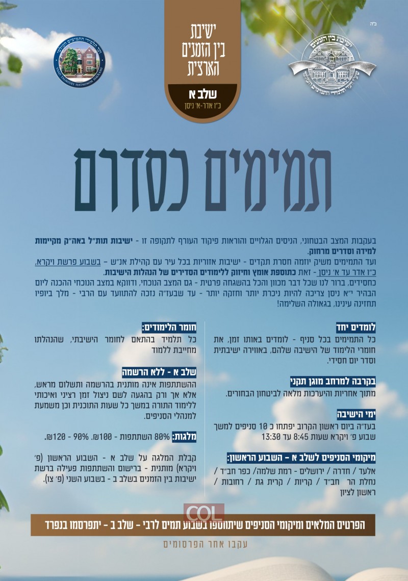 החל מהיום - יום ראשון, כ"ו באדר, ועד ליום חמישי א' בניסן, ייפתחו סניפים אזוריים בערים רבות. המטרה המרכזית היא לאפשר לכל בחור להמשיך את סדרי הישיבה באווירה לימודית וחסידית, בקרבה למרחב מוגן תקני ותחת השגחה מלאה.
