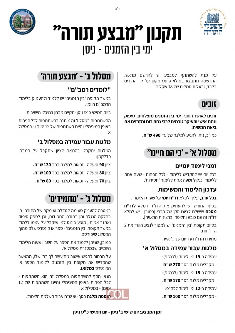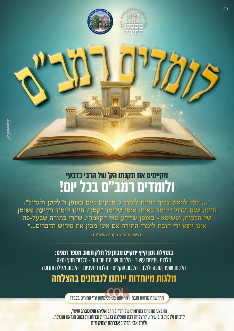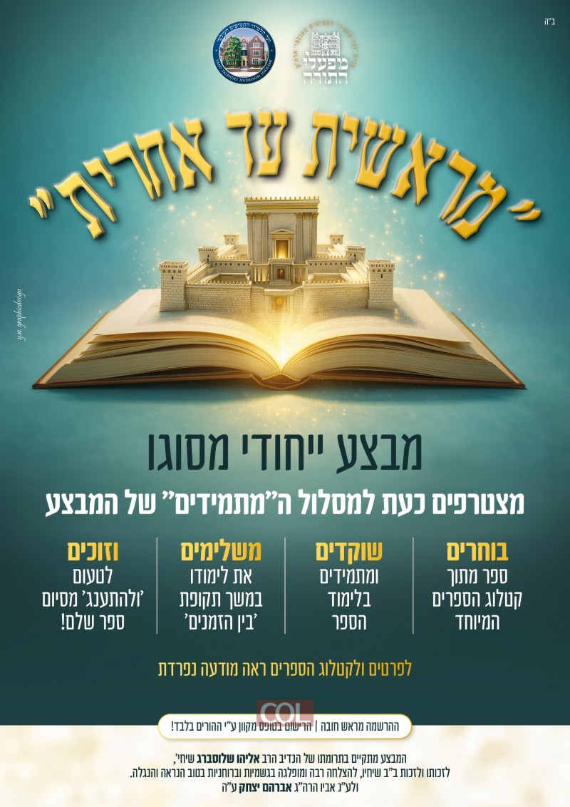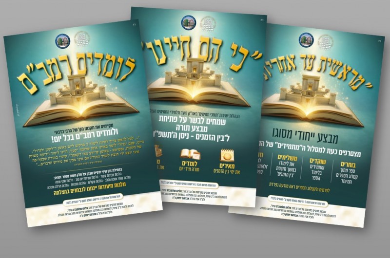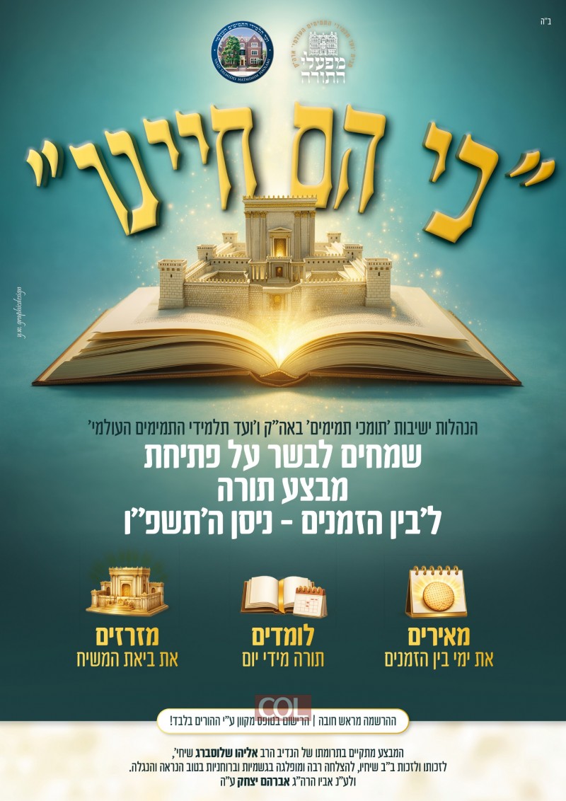 תחת הכותרת המהדהדת "כי הם חיינו", יוצאים הנהלות הישיבות בארה"ק בשיתוף 'ועד תלמידי התמימים העולמי' ב"מבצע תורה" המרכזי לחודש ניסן ה'תשפ"ו. המבצע נועד להפוך את ימי המנוחה לימים של התחזקות והוספה בלימוד התורה – כרצונו הקדוש של כ"ק אדמו"ר נשיא דורנו.