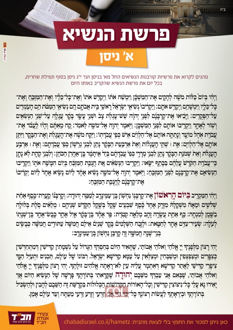 נוהגים לקרוא את פרשיות קורבנות הנשיאים החל מא' בניסן ועד י"ב ניסן, לאחר תפילת שחרית. בכל יום את פרשת הנשיא שהקריב באותו היום | כשירות לגולשים מפרסם COL בכל יום את פרשת הנשיא המתאימה לאותו יום