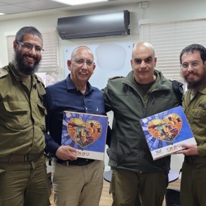 לקראת חג הפסח: סא"ל ר' מנחם דנה ושליח הרבי במרכז הרפואי 'שמיר' - הרב מנדי בקרמן, העניקו 'מצה שמורה' למפקד מרכז ההספקה המטכ"לי - תא"ל חוגי נחום, וליו"ר ארגון עובדי צה"ל - מאיר בן הרוש