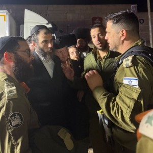 העיתונאי החב"די ר' מנדי ריזל, המשמש כמפקד דסק במגזר החרדי במחוז דרום בפיקוד העורף, והחייל יחיאל רובינשטיין מהדסק החרדי - בהערכת מצב בזירת הנפילה בערד עם מפקד המחוז בפיקוד העורף, ועם מוטי בבציק