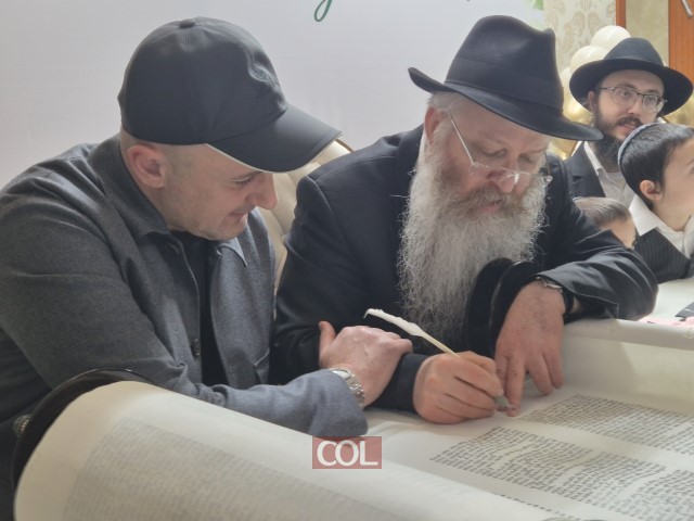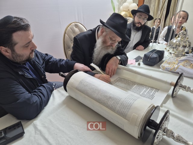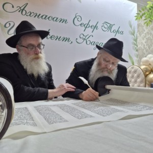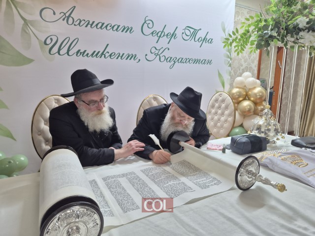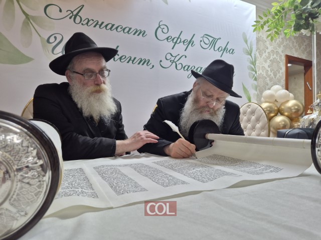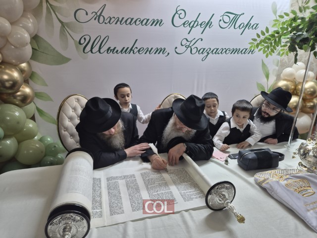 שמחה גדולה ומרגשת בעיר שימקנט שבקזחסטן: ספר תורה חדש הוכנס ברוב פאר והדר לבית כנסת חב״ד ליובאוויטש, בראשות השלוחים הרב מרדכי ורעייתו שושנה מרוזוב | בטקס השתתפו שלוחים מרחבי המדינה, יחד עם בני הקהילה הנרגשים, שבאו לחלוק כבוד לתורה | הסופר הרב מישולובין ממוסקבה הגיע במיוחג, והמשתתפים התכבדו בכתיבת האותיות האחרונות