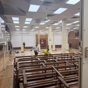 בית המדרש הגדול של בית חיינו 770 מקורצף לקראת חג הפסח, הפועלים עמלים על ניקוי המקום בעוד הקהל שוהה מחוץ לבית הכנסת. צילום: שמואל בצלאל דהן