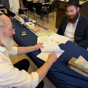 הרב יעקב ישראל ורעייתו חיה מושקא אדרי יוצאים בשליחות הרבי לכפר סבא, ויפעלו בשכונה הירוקה 80 | בתמונה: בחתימה עם השליח הראשי לעיר הרב אהרן קנייבסקי