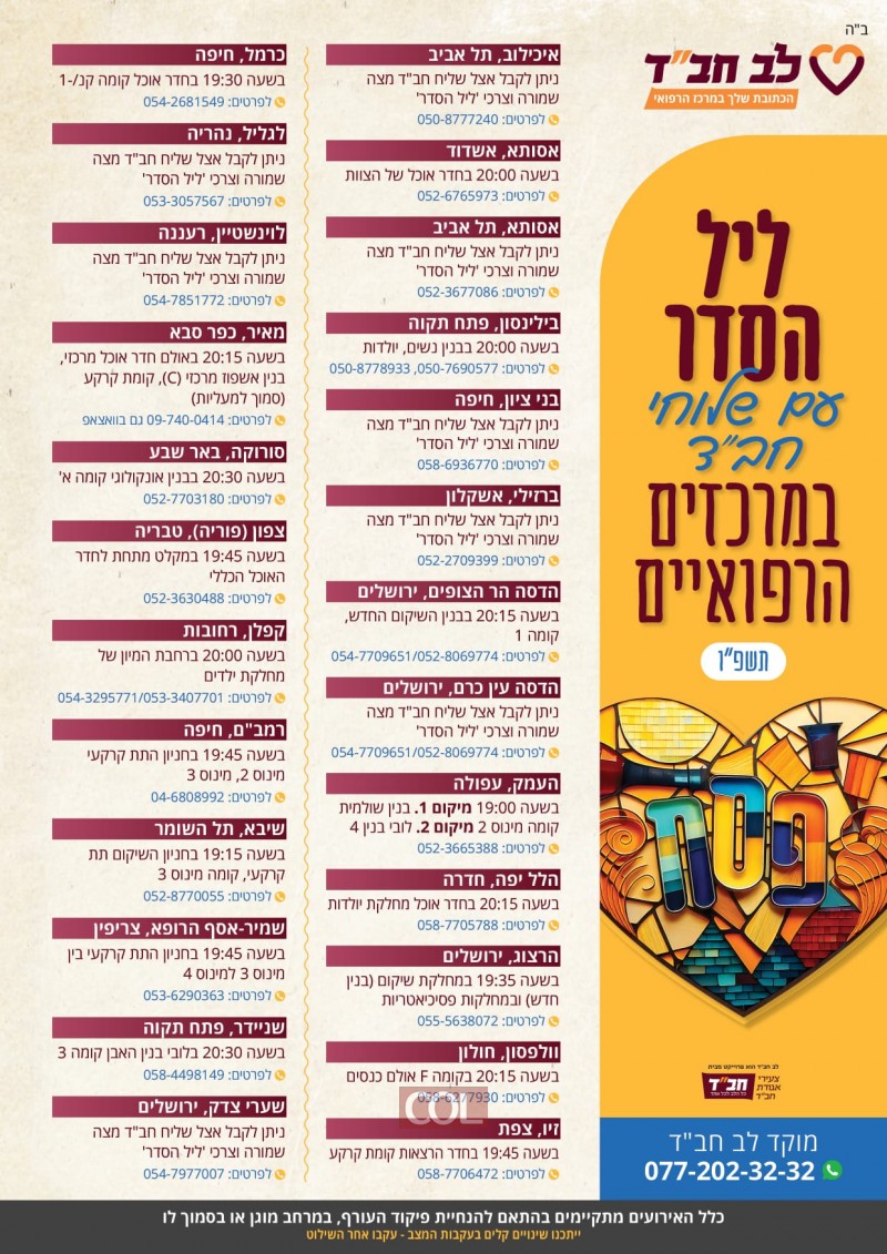 בפרויקט 'לב חב"ד' של צעירי חב"ד, המאגד עשרות רבות של שלוחי חב"ד הפועלים בכל המרכזים הרפואיים ברחבי הארץ, מתכוננים השנה במתכונת מיוחדת כדי לערוך את ליל הסדר בחניונים ובמקלטים התת-קרקעיים, אליהם הועברו המאושפזים בעקבות מבצע 'שאגת הארי'.