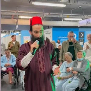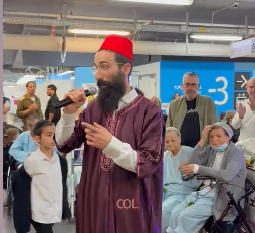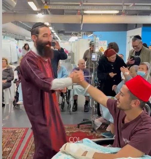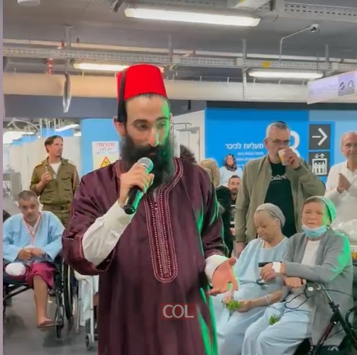 בלבוש המסורתי: שליח הרבי במרכז הרפואי רמב"ם בחיפה - הרב שמואל טורקוב, חוגג עם הצוות והמאושפזים את המימונה בצאת חג הפסח