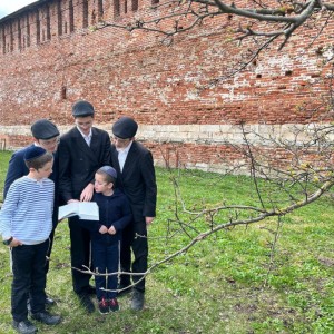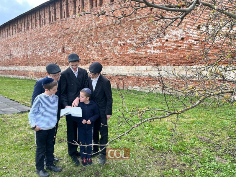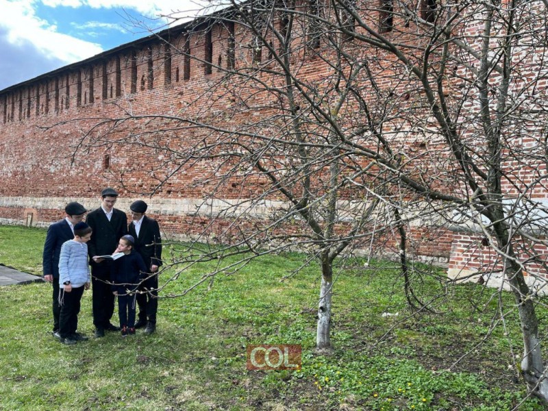לקראת סוף חודש ניסן: בני משפחת מונדשיין - השלוחים בעיר סלמונסק שברוסיה, בברכת האילנות בחצר בנייני הקהילה ובית חב"ד, למרגלות החומה העתיקה, דרכה עבר אדמו"ר הזקן במסעו האחרון