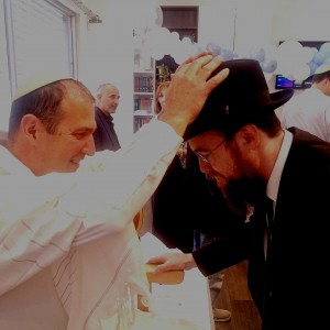 על "כיסא של אליהו" של הבית חב״ד הישראלי": שליח הרבי לקהילה הישראלית בלונדון שבאנגליה - הרב שניאור גליצנשטיין, מתברך מהסנדק בברית לנכדו