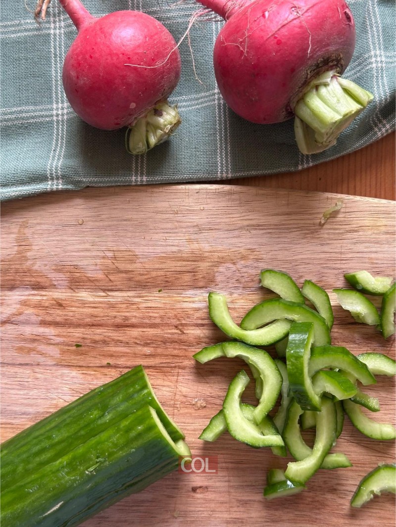 • 1 מלפפון גדול וקשיח (או 2 קטנים), חצוי, מרוקן מהחלק הרך וחתוך לחצאי ירח