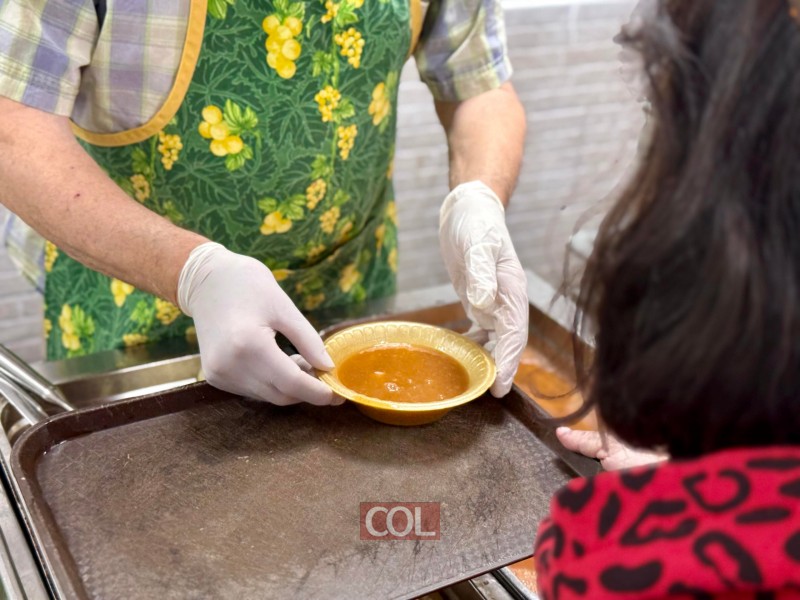 בחדר גדול מסודרים שולחנות ושתי עמדות חלוקת מזון. נתחי בשר, אורז, מרק חם, כמה סוגי סלטים ועוד – הכול תרומת גופים פרטיים, על מנת למנוע מאנשים שזקוקים לכך, להיות רעבים. חלק מהבאים בשערי מרכז ההסעדה לוקחים עמם קופסאות פלסטיק, אותן ממלאים בעמדות החלוקה, כדי שיוכלו לקחתם הביתה. בזמן המלחמה אף הגדילו לעשות בשינוע מיוחד עד לבתי הנזקקים.