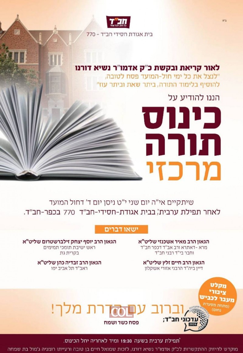 חודש ניסן בבית "אגודת חסידי חב"ד" – 770 בכפר חב"ד הוא תמיד חודש עמוס של עשייה, אך השנה נשברו השיאים של כל הזמנים, למרות המצב המתוח של המלחמה ומטחי הטילים הבלתי פוסקים על הכפר, הסמוך לנתב"ג.