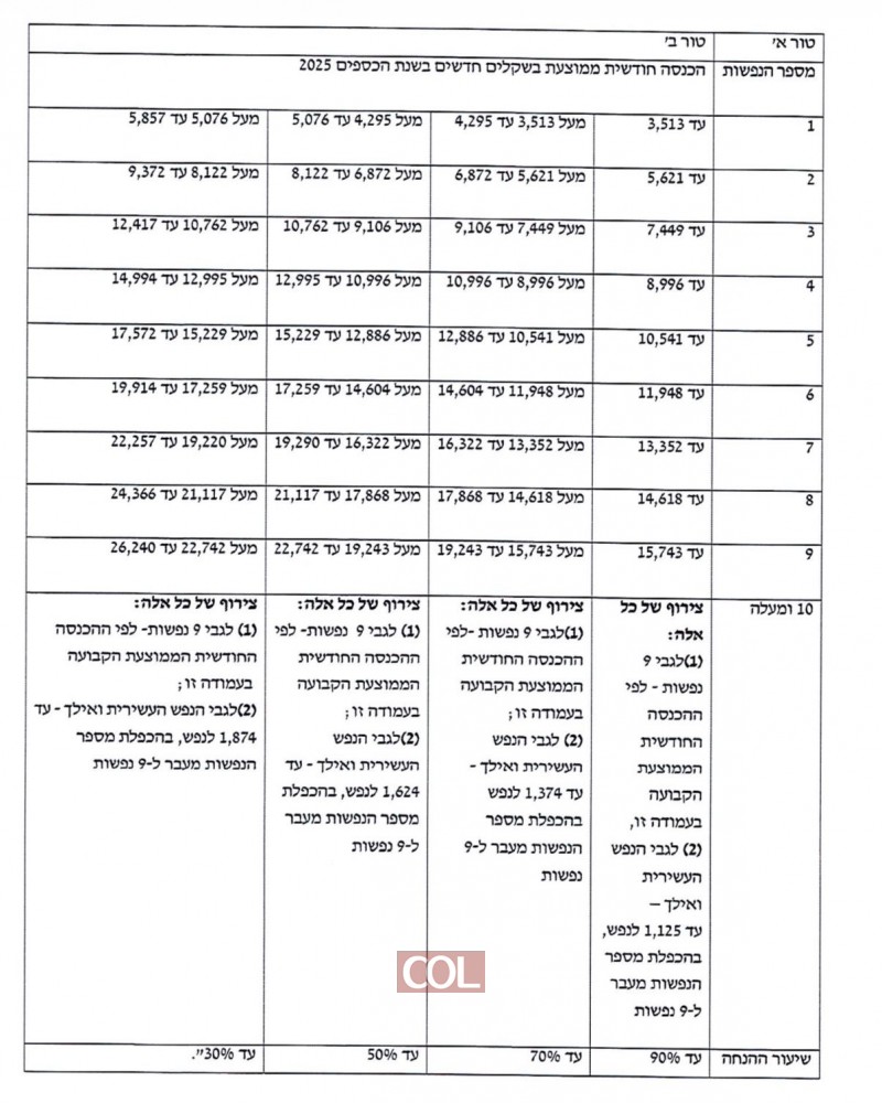 טבלת ההנחות שפורסמה (מצ"ב) מבוססת על עדכון מנגנון מבחן ההכנסה והצמדתו לשכר המינימום במשק, תוך התחשבות במספר הנפשות במשק הבית.