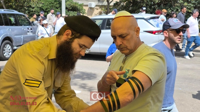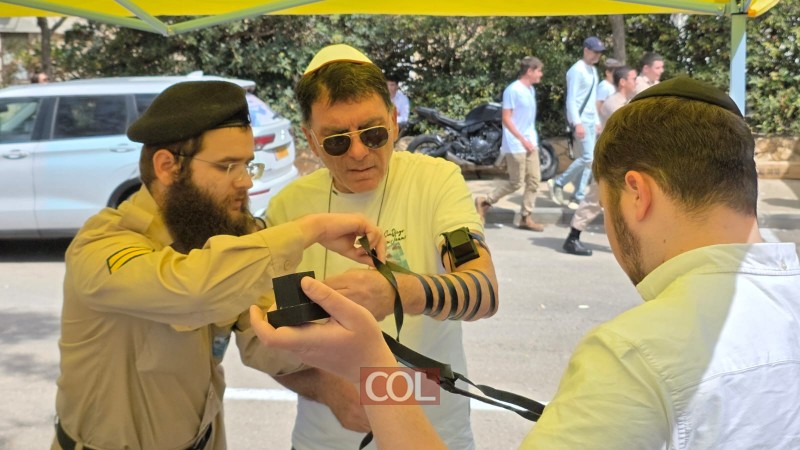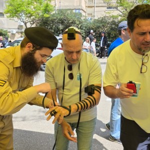 אהרון גרוזמן, חסיד חב״ד ממגדל העמק, מניח תפילין לכל באי יום הזיכרון בית העלמין הגדול הצבאי בחיפה. צילום: מאיר דהן