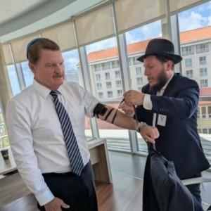 מייק עימאן, ראש הממשלה היהודי של מדינת ארובה שבאיים הקאריביים הנחשבת כטריטוריה הולנדית., מניח תפילין בלשכתו יחד עם שליח הרבי ומנהל בית חב"ד באי - הרב אהרון בלסברג