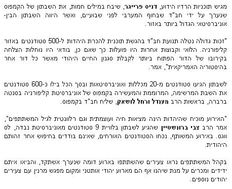 מגיש תוכניות הרדיו הידוע, דניס פרייגר, שיבח במילים חמות, את השבתון של הקמפוס שנערך על ידי חב"ד שבחוף המערבי לפני שבועיים, ואשר היווה השבתון הבין-אוניברסיטאי הגדול ביותר באזור ■ "זכות גדולה נטלה תנועת חב"ד בהגשת תוכנית להכרת היהדות ל-500 סטודנטים באזור קליפורניה. הלוואי וקבוצות אחרות היו פועלות כך שאם כן, בודאי היו נוחלות הצלחה בקירובו של הדור הפתוח ביותר לקבלת סגנון החיים היהודי מאשר כל דור אחר בהיסטוריה האמריקאית", אמר לסיפור המלא