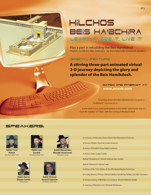מסע תלת-מימד המציג את בית-המקדש במלוא תפארתו מוצע עכשיו לצפייה מצומצמת באינטרנט. האתר anash.com מציג את הבית השני כפי שלא נראה עד תשעה באב. אלפי גולשים צפו במסע הוירטואלי בשנה שעברה. הסיור מתחיל דרך דלתות המקדש, הלשכות, העזרה, הקודש ואפילו קודש הקדשים. ניתן ללמוד ממנו על העיצוב, השימוש והמטרה של כל כלי המקדש. עוד באתר: 11 שיעורים באנגלית בענייני בית הבחירה, הנהוג ללומדם בשלושת השבועות.