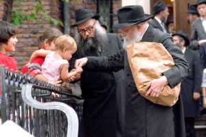 הרבי מעניק מטבע לצדקה לפעוטה בדרכו לאוהל, ז' תשרי תשמ"ו. צילום: לוי יצחק פריידין, באדיבות JEM | צילום מלא