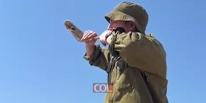 "אִם יִתָּקַע שׁוֹפָר בְּעִיר וְעָם לֹא יֶחֱרָדוּ": לוחם מחיל התותחנים תוקע בשופר לפני שחבריו יורים את הפגזים לעיר עזה. צילום: 'עזר לחייל' כפר חב"ד. צפו: